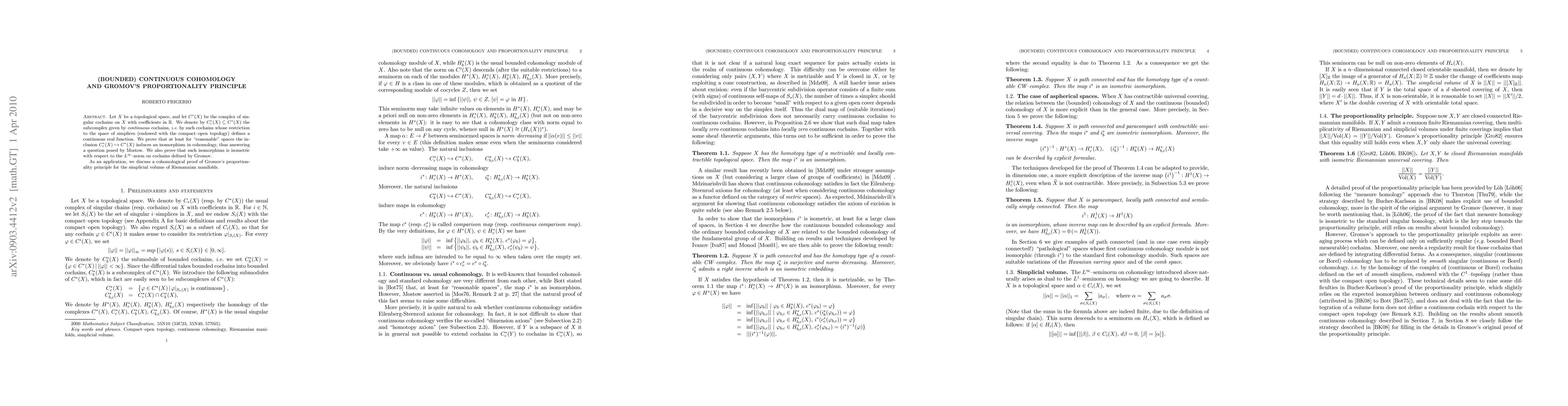 This research proves that for 'reasonable' topological spaces, the inclusion of continuous cochains into singular cochains induces an isomorphism in cohomology, addressing a question by Mostow. Additionally, this isomorphism is shown to be isometric under the L^infty-norm, as per Gromov. The findings are applied to provide a cohomological proof of Gromov's proportionality principle for simplicial volume of Riemannian manifolds.