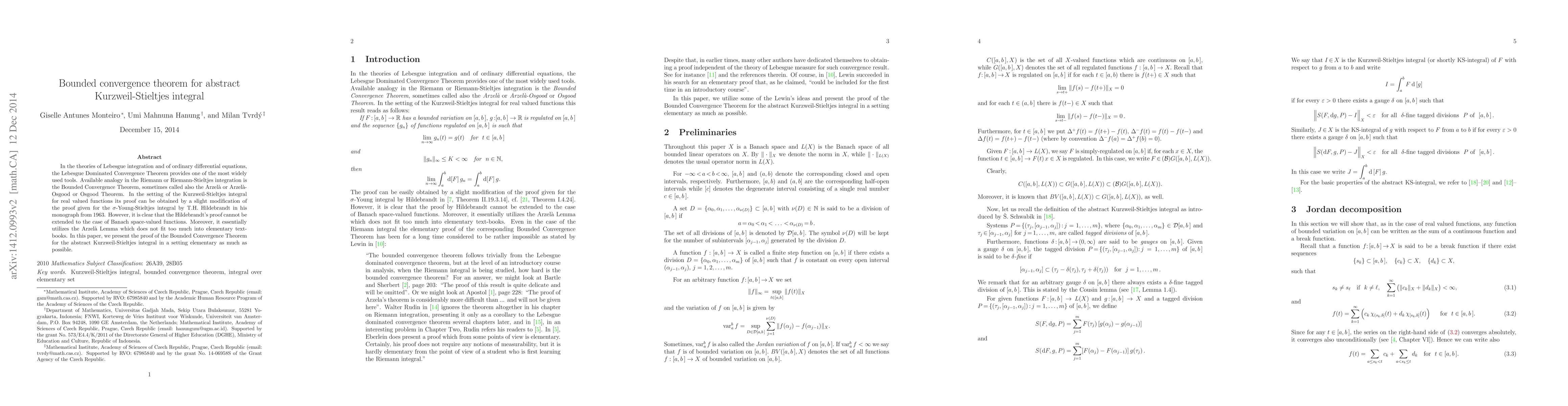 In the theories of Lebesgue integration and of ordinary differential equations, the Lebesgue Dominated Convergence Theorem provides one of the most widely used tools. Available analogy in the Riemann or Riemann-Stieltjes integration is the Bounded Convergence Theorem, sometimes called also the Arzela or Arzela-Osgood or Osgood Theorem. In the setting of the Kurzweil-Stieltjes integral for real valued functions its proof can be obtained by a slight modification of the proof given for the Young-Stieltjes integral by Hildebrandt in his monograph from 1963. However, it is clear that the proof by Hildebrandt cannot be extended to the case of Banach space-valued functions. Moreover, it essentially utilizes the Arzela Lemma which does not fit too much into elementary text-books. In this paper, we present the proof of the Bounded Convergence Theorem for the abstract Kurzweil-Stieltjes integral in a setting elementary as much as possible.