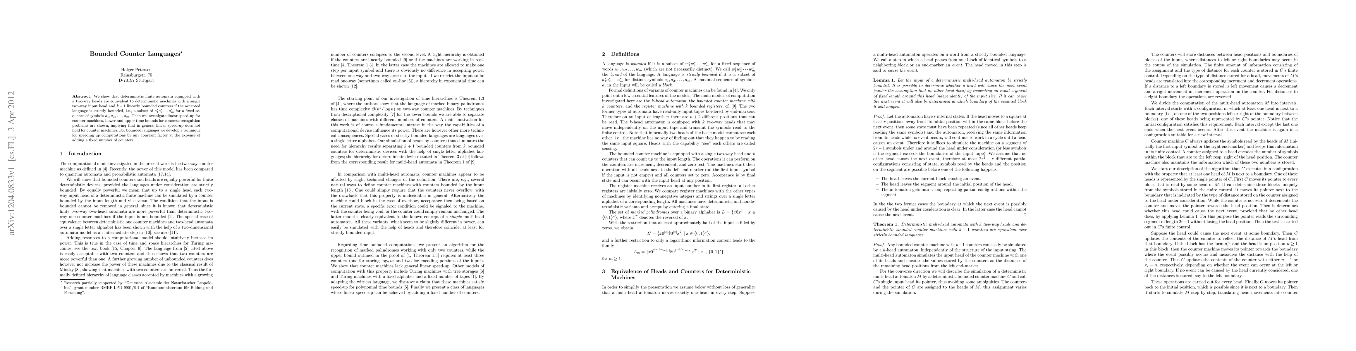 Researchers show that deterministic finite automata with k two-way heads can be equivalent to counter machines with a single input head and k-1 counters for strictly bounded languages. They also find that linear speed-up is not always possible for counter machines.