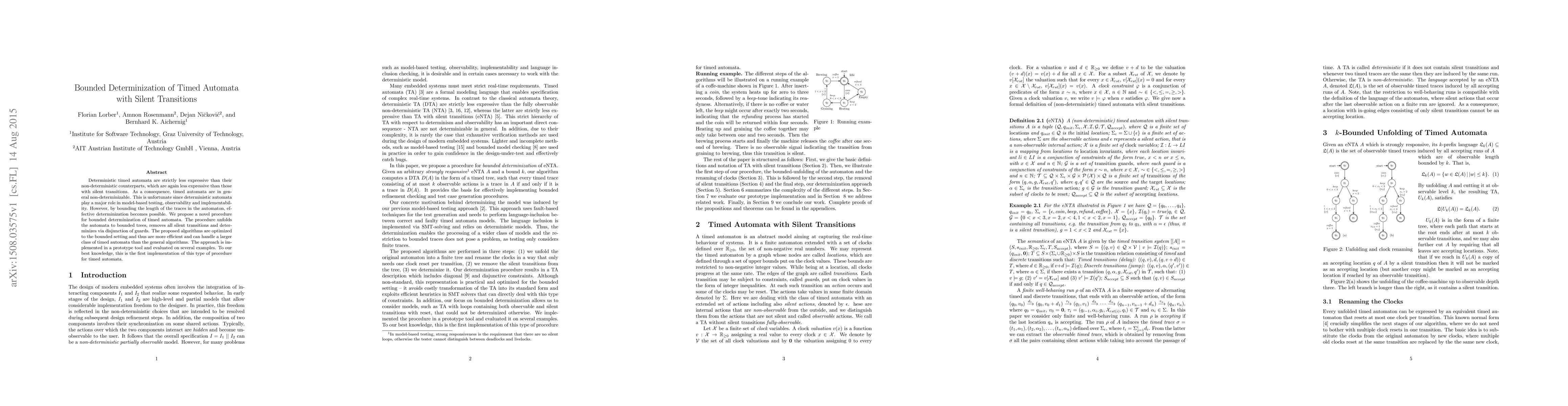 Deterministic timed automata are strictly less expressive than their non-deterministic counterparts, which are again less expressive than those with silent transitions. As a consequence, timed automata are in general non-determinizable. This is unfortunate since deterministic automata play a major role in model-based testing, observability and implementability. However, by bounding the length of the traces in the automaton, effective determinization becomes possible. We propose a novel procedure for bounded determinization of timed automata. The procedure unfolds the automata to bounded trees, removes all silent transitions and determinizes via disjunction of guards. The proposed algorithms are optimized to the bounded setting and thus are more efficient and can handle a larger class of timed automata than the general algorithms. The approach is implemented in a prototype tool and evaluated on several examples. To our best knowledge, this is the first implementation of this type of procedure for timed automata.