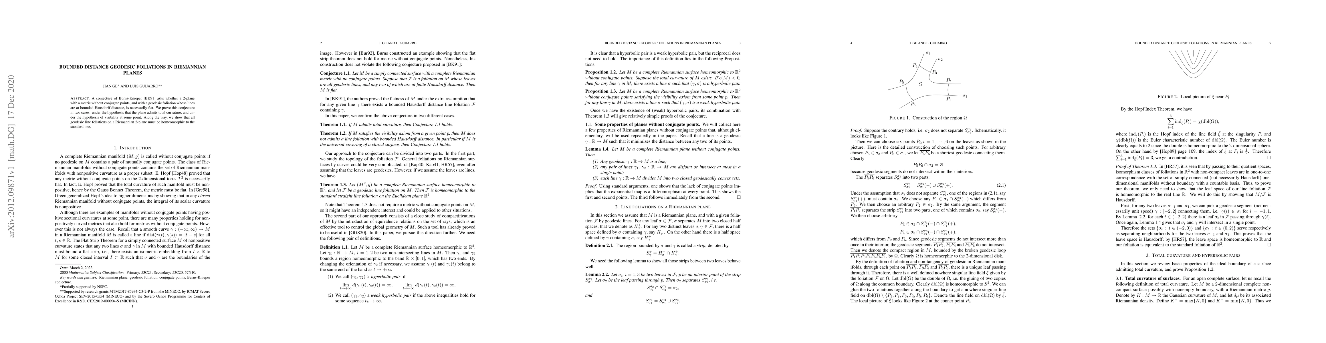 The research confirms Burns and Knieper's conjecture that a 2-plane with a metric free of conjugate points and bounded Hausdorff distance geodesic foliations must be flat, specifically under conditions of total curvature or visibility at a point. Additionally, it establishes that all geodesic line foliations on such planes are homeomorphic to the standard one.
