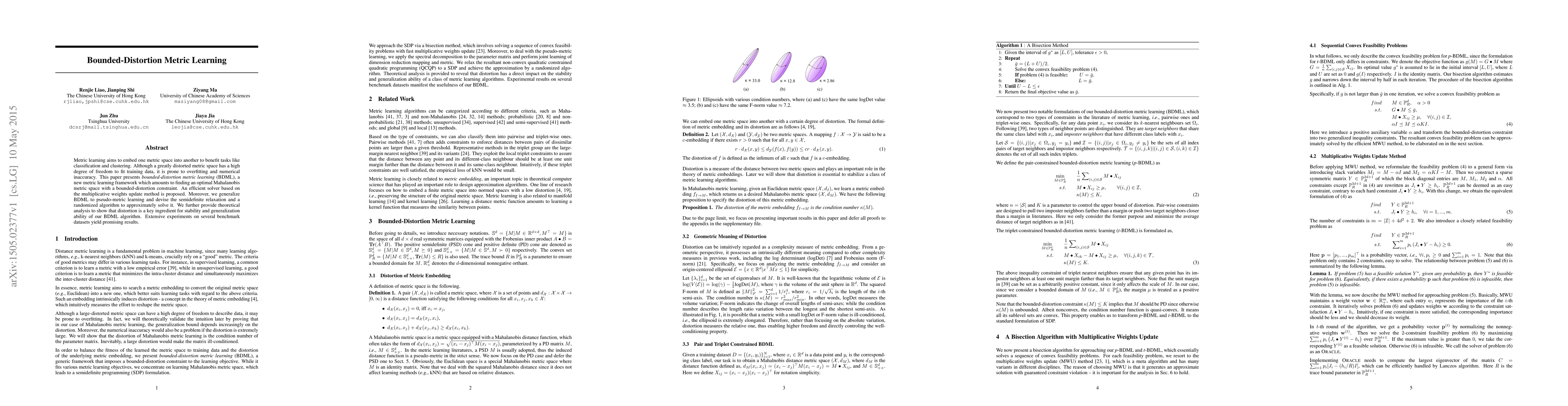 This paper introduces Bounded-Distortion Metric Learning (BDML), a metric learning framework that finds an optimal Mahalanobis metric space with a bounded-distortion constraint to avoid overfitting and numerical inaccuracy.