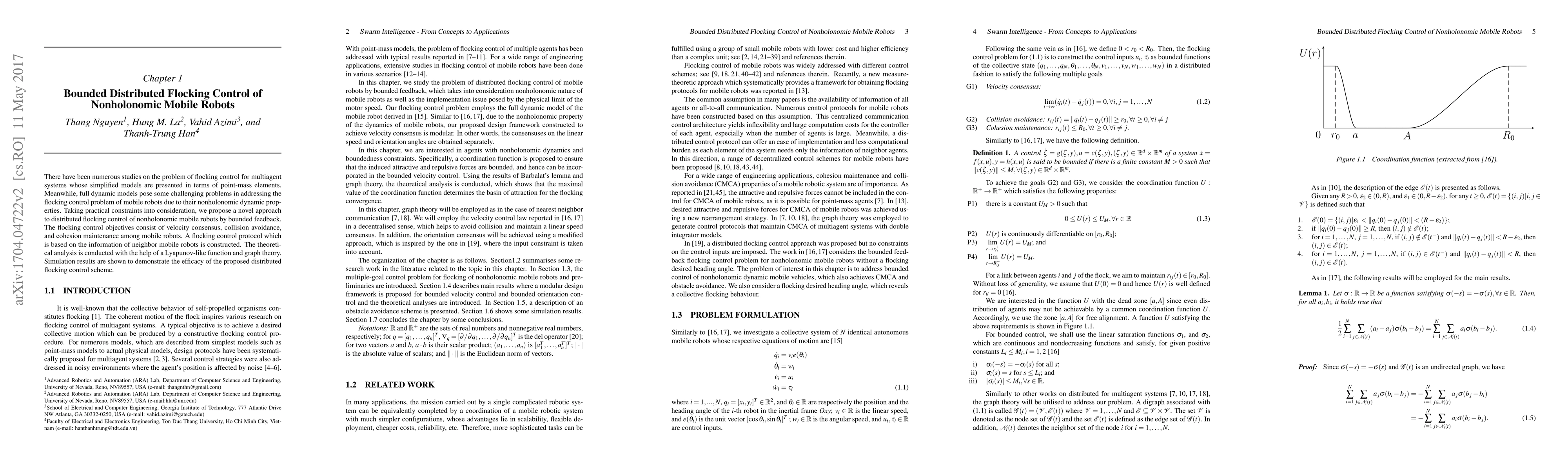 This paper proposes a novel distributed flocking control approach for nonholonomic mobile robots using bounded feedback, addressing velocity consensus, collision avoidance, and cohesion. The method leverages neighbor information and theoretical analysis via Lyapunov-like functions and graph theory, validated by simulation results.