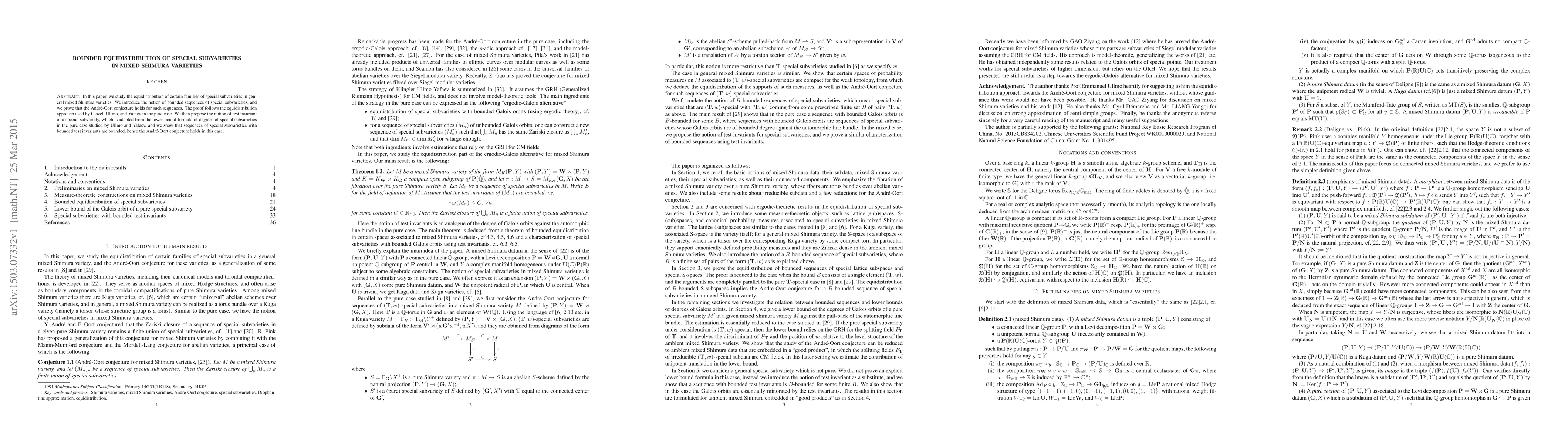 In this paper we prove the equidistribution of bounded sequences of special subvarieties in a general mixed Shimura varieties, a notion adapted from the pure case treated by Clozel, Ullmo, and Yafaev in the study of the Andre-Oort conjecture. We also discuss the relation of bounded sequences with bounded Galois orbits of special subvarieties.