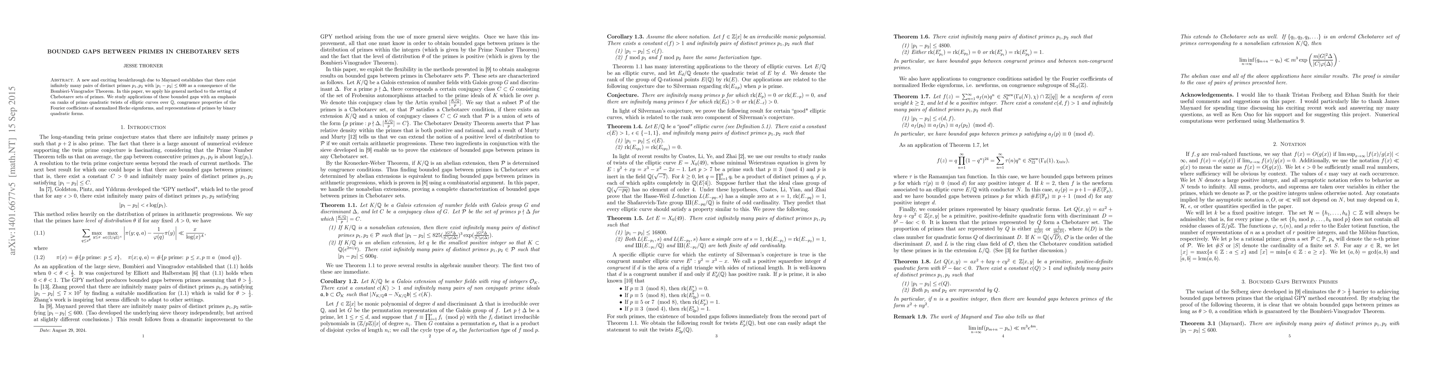 Maynard's method is applied to Chebotarev sets to establish infinitely many pairs of primes with bounded gaps, extending the original result to prime quadratic twists, Fourier coefficients, and binary quadratic forms. This work deepens understanding of prime distribution and related number-theoretic structures.