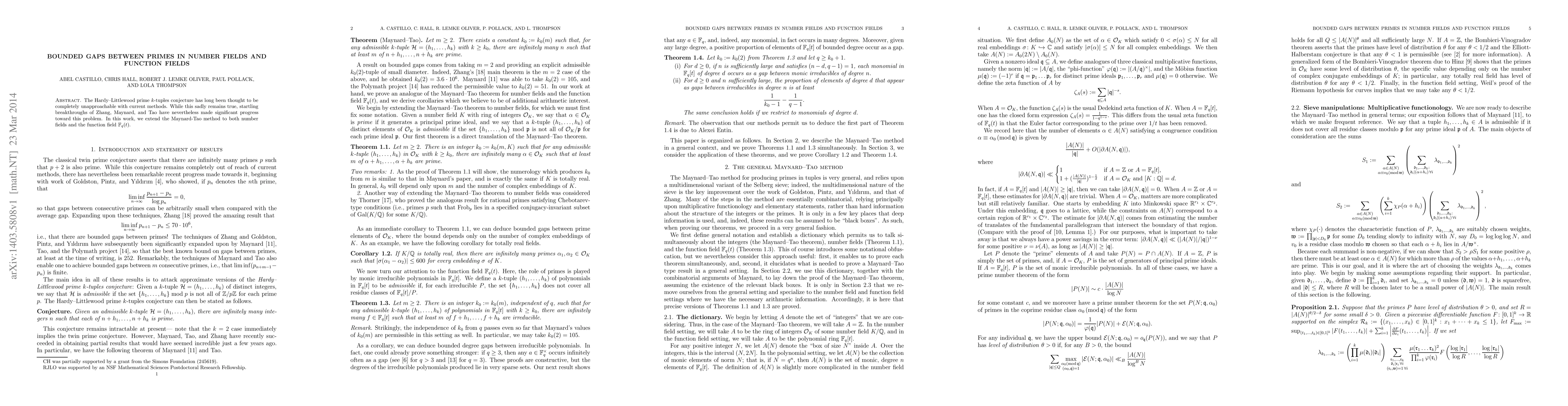 This research extends the Maynard-Tao method to number fields and function fields, building on breakthroughs by Zhang, Maynard, and Tao, though the complete Hardy-Littlewood conjecture remains elusive.