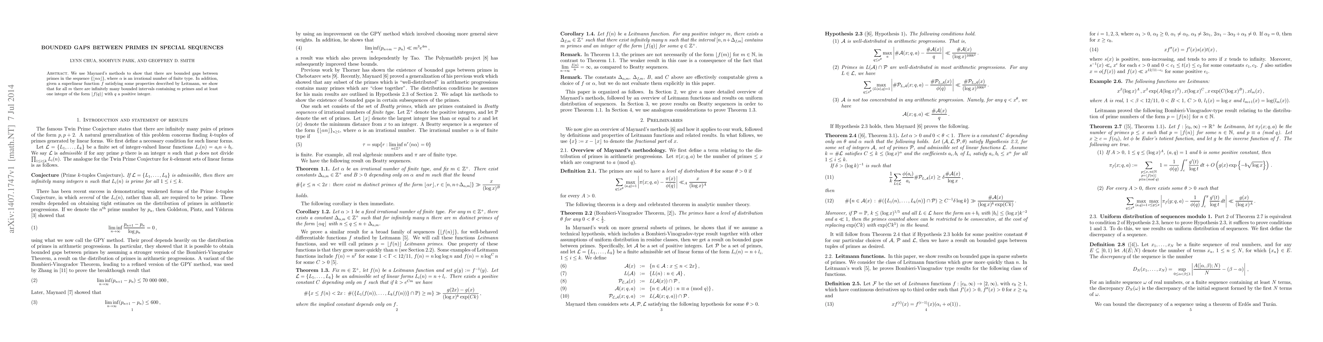 This paper demonstrates bounded gaps between primes in sequences formed by scaling irrational numbers of finite type, employing Maynard's techniques. It also proves the existence of infinitely many bounded intervals containing a given number of primes and specific integers derived from superlinear functions.
