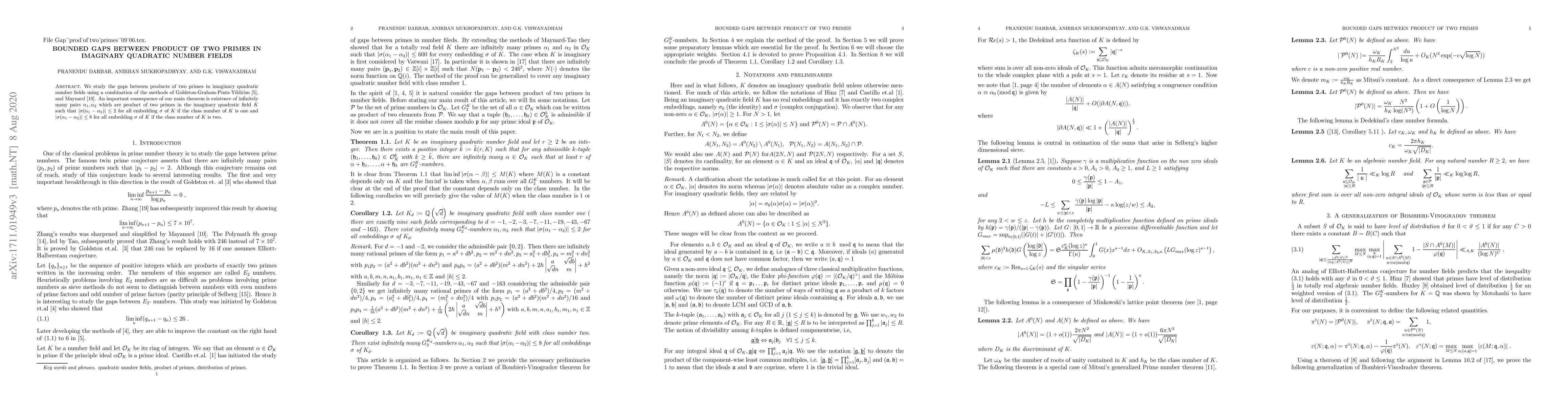 This paper investigates gaps between products of two primes in imaginary quadratic number fields, showing infinitely many pairs with specific constraints on class numbers.
