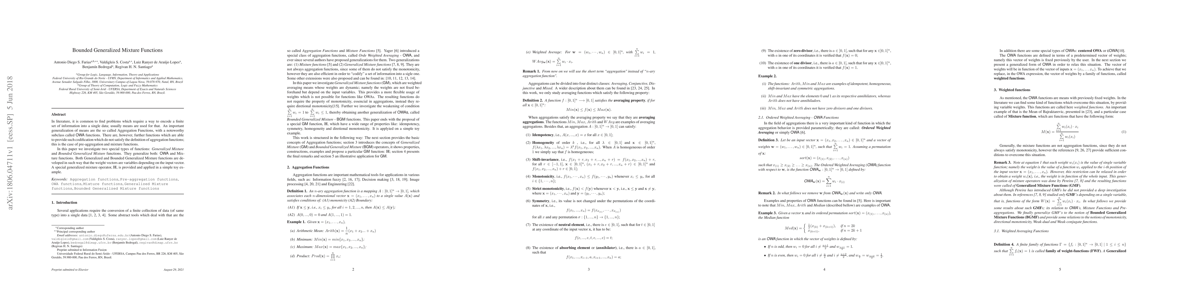 This paper explores Generalized Mixture and Bounded Generalized Mixture functions, which generalize OWA and Mixture functions by allowing weight vectors to vary with the input vector. A specific generalized mixture operator, H, is introduced and demonstrated through a simple example.