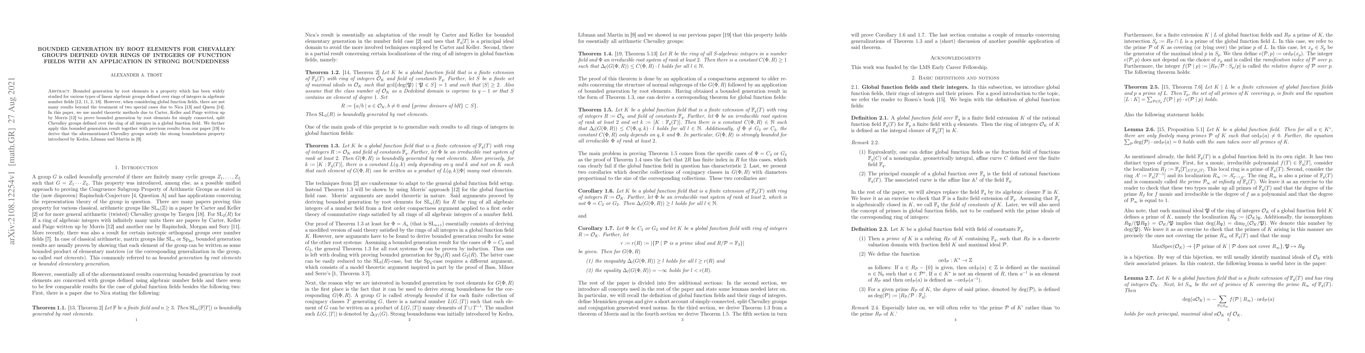 This paper proves bounded generation by root elements for simply connected, split Chevalley groups over global function fields using model theoretic methods, and applies this result to show that these groups satisfy the strong boundedness property.