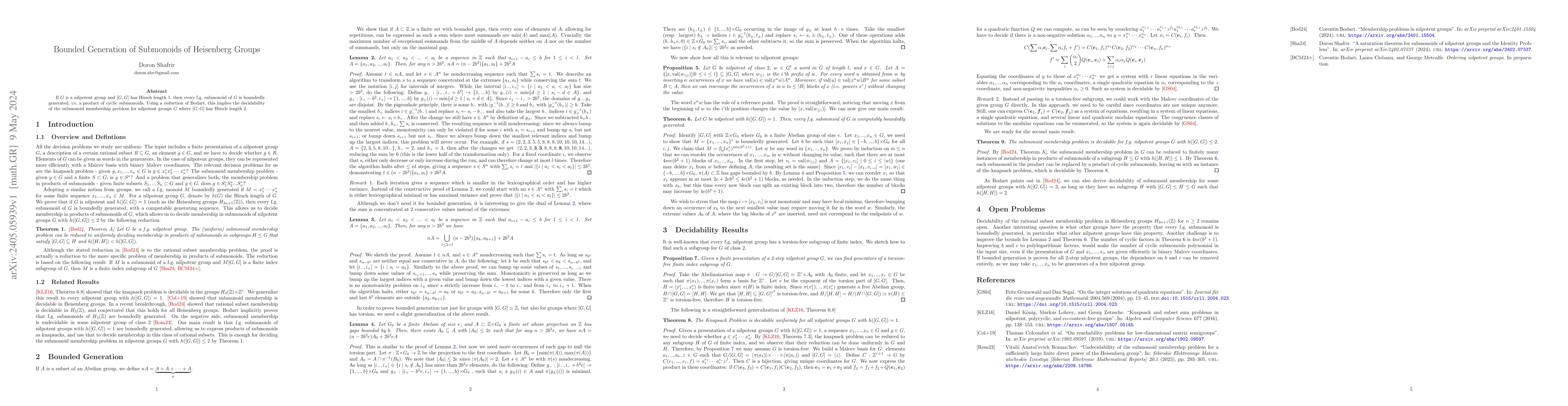 If $G$ is a nilpotent group and $[G,G]$ has Hirsch length $1$, then every f.g. submonoid of $G$ is boundedly generated, i.e. a product of cyclic submonoids. Using a reduction of Bodart, this implies the decidability of the submonoid membership problem for nilpotent groups $G$ where $[G,G]$ has Hirsch length $2$.