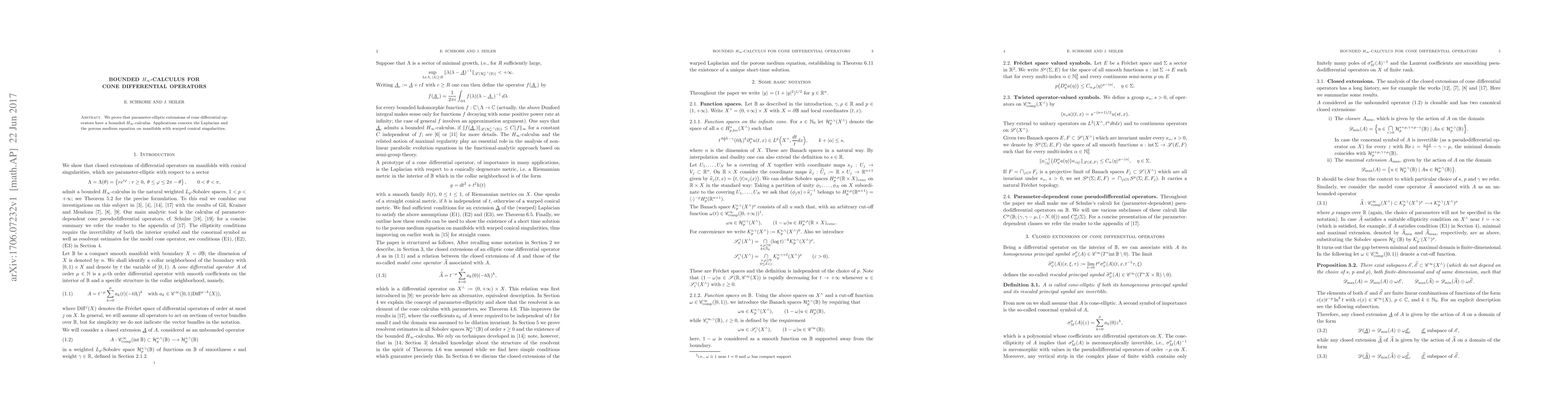 We prove that parameter-elliptic extensions of cone differential operators have a bounded $H_\infty$-calculus. Applications concern the Laplacian and the porous medium equation on manifolds with warped conical singularities.