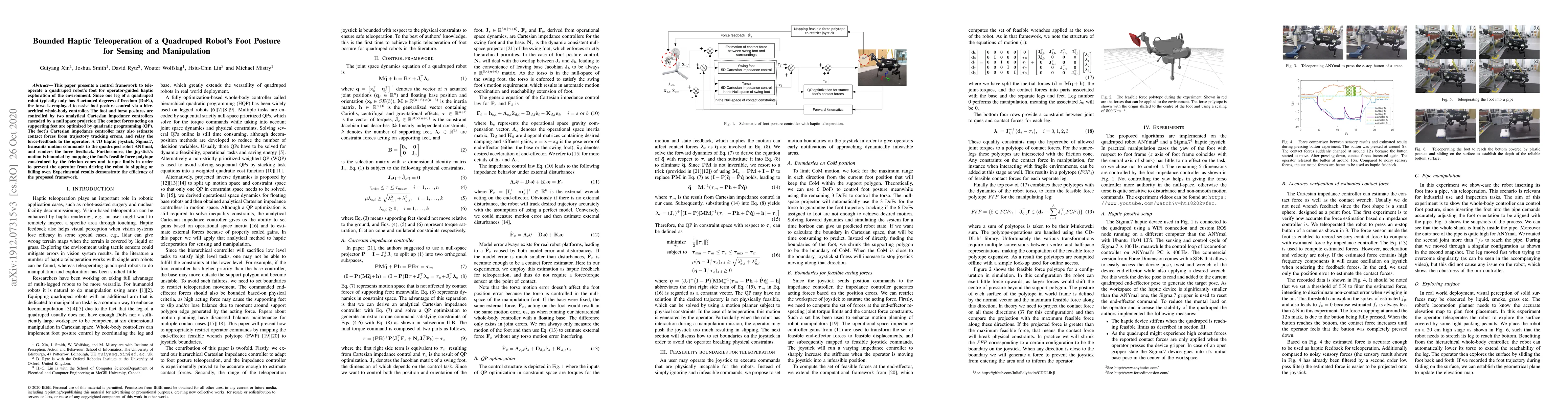A control framework enables operator-guided haptic exploration of quadruped robots using foot posture control with a hierarchical whole-body controller. Experimental results demonstrate the efficiency of this framework in sensing and manipulation tasks.