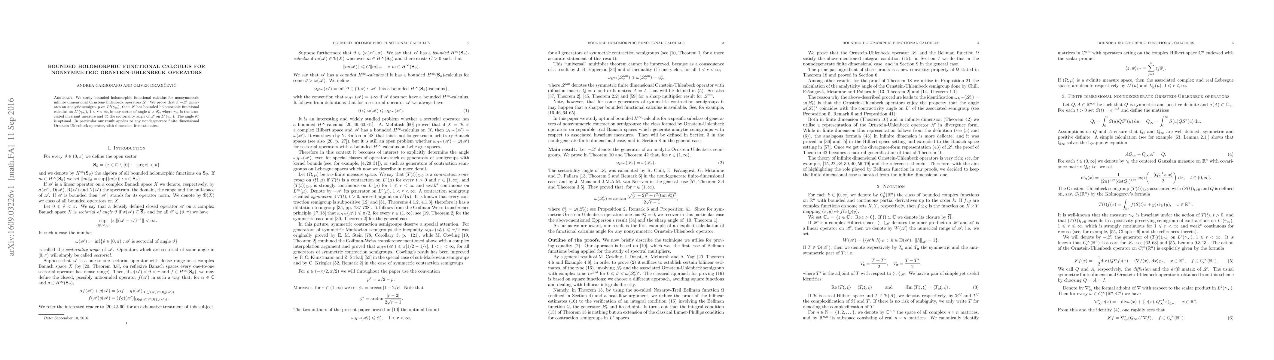 This paper establishes bounded holomorphic functional calculus for nonsymmetric infinite-dimensional Ornstein-Uhlenbeck operators, showing that if the negative of the operator generates an analytic semigroup, it has bounded functional calculus in any sector angle greater than the optimal sectoriality angle. The result extends to nondegenerate finite-dimensional cases with dimension-free estimates.