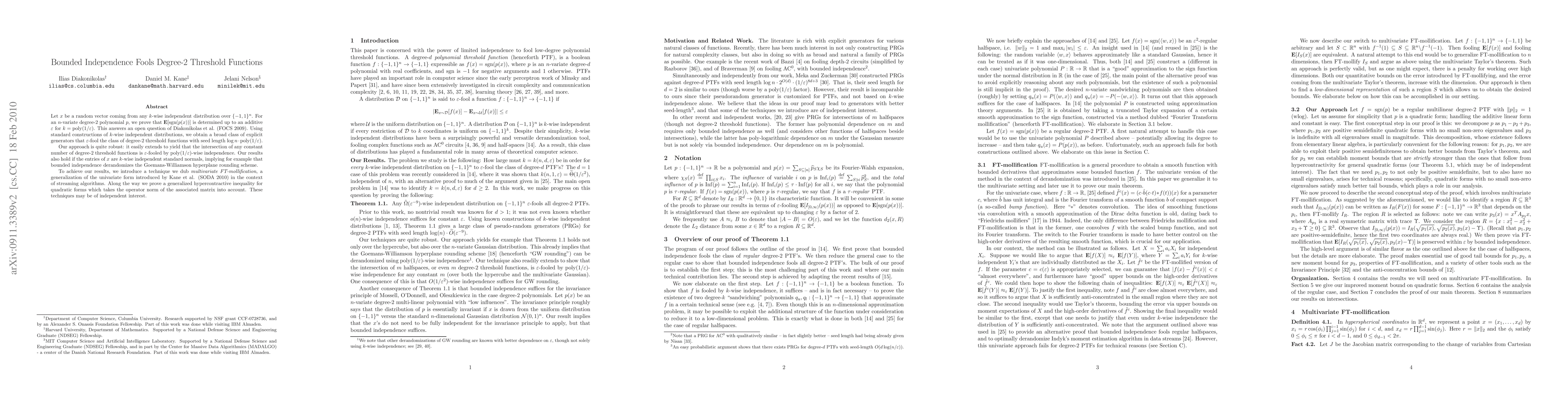 Let x be a random vector coming from any k-wise independent distribution over {-1,1}^n. For an n-variate degree-2 polynomial p, we prove that E[sgn(p(x))] is determined up to an additive epsilon for k = poly(1/epsilon). This answers an open question of Diakonikolas et al. (FOCS 2009). Using standard constructions of k-wise independent distributions, we obtain a broad class of explicit generators that epsilon-fool the class of degree-2 threshold functions with seed length log(n)*poly(1/epsilon). Our approach is quite robust: it easily extends to yield that the intersection of any constant number of degree-2 threshold functions is epsilon-fooled by poly(1/epsilon)-wise independence. Our results also hold if the entries of x are k-wise independent standard normals, implying for example that bounded independence derandomizes the Goemans-Williamson hyperplane rounding scheme. To achieve our results, we introduce a technique we dub multivariate FT-mollification, a generalization of the univariate form introduced by Kane et al. (SODA 2010) in the context of streaming algorithms. Along the way we prove a generalized hypercontractive inequality for quadratic forms which takes the operator norm of the associated matrix into account. These techniques may be of independent interest.