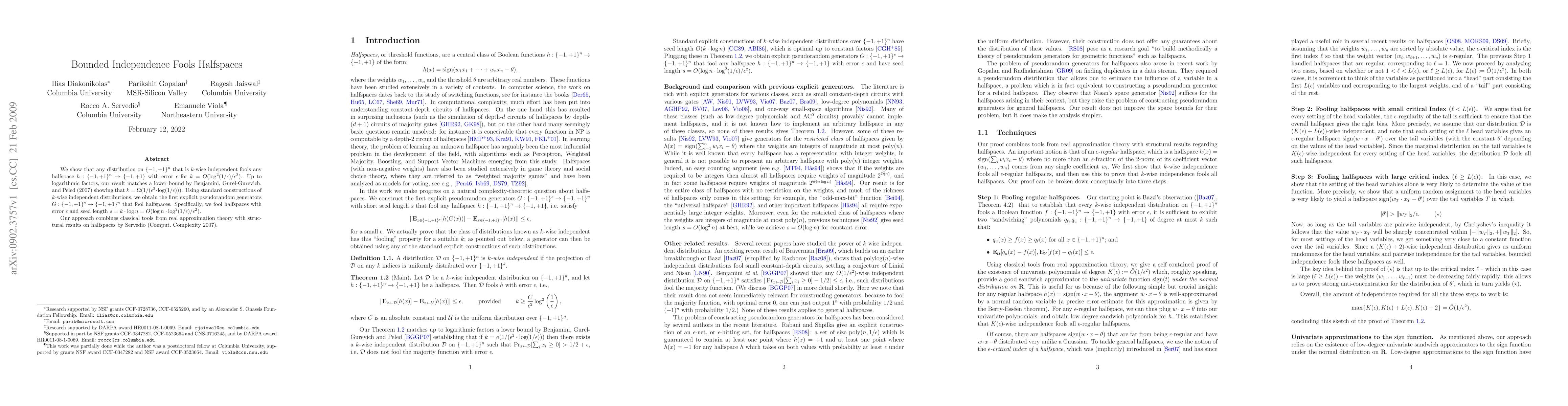 We show that any distribution on {-1,1}^n that is k-wise independent fools any halfspace h with error \eps for k = O(\log^2(1/\eps) /\eps^2). Up to logarithmic factors, our result matches a lower bound by Benjamini, Gurel-Gurevich, and Peled (2007) showing that k = \Omega(1/(\eps^2 \cdot \log(1/\eps))). Using standard constructions of k-wise independent distributions, we obtain the first explicit pseudorandom generators G: {-1,1}^s --> {-1,1}^n that fool halfspaces. Specifically, we fool halfspaces with error eps and seed length s = k \log n = O(\log n \cdot \log^2(1/\eps) /\eps^2). Our approach combines classical tools from real approximation theory with structural results on halfspaces by Servedio (Computational Complexity 2007).