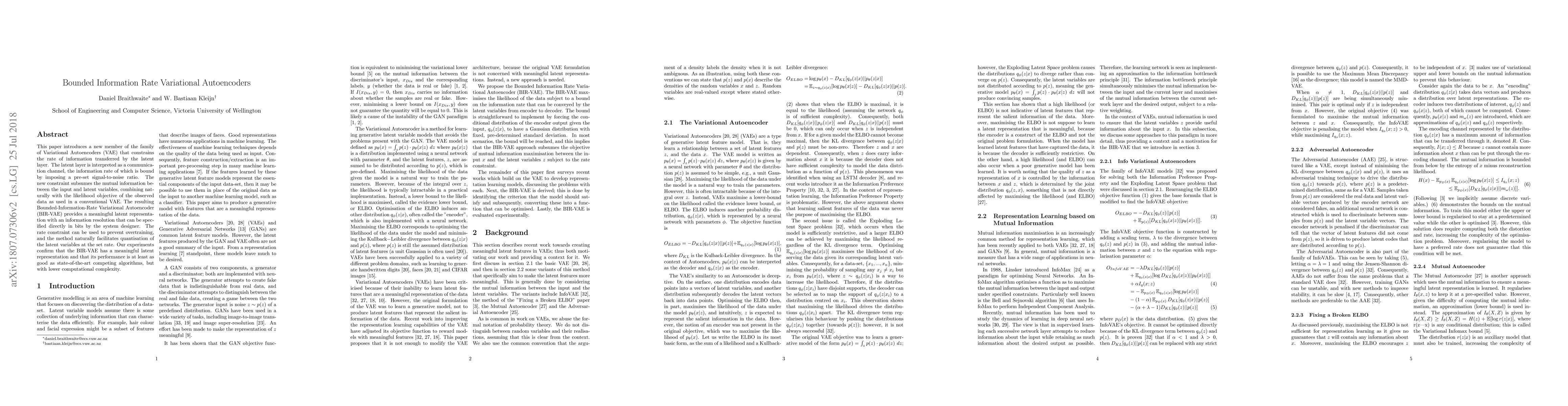 This paper introduces a new member of the family of Variational Autoencoders (VAE) that constrains the rate of information transferred by the latent layer. The latent layer is interpreted as a communication channel, the information rate of which is bound by imposing a pre-set signal-to-noise ratio. The new constraint subsumes the mutual information between the input and latent variables, combining naturally with the likelihood objective of the observed data as used in a conventional VAE. The resulting Bounded-Information-Rate Variational Autoencoder (BIR-VAE) provides a meaningful latent representation with an information resolution that can be specified directly in bits by the system designer. The rate constraint can be used to prevent overtraining, and the method naturally facilitates quantisation of the latent variables at the set rate. Our experiments confirm that the BIR-VAE has a meaningful latent representation and that its performance is at least as good as state-of-the-art competing algorithms, but with lower computational complexity.