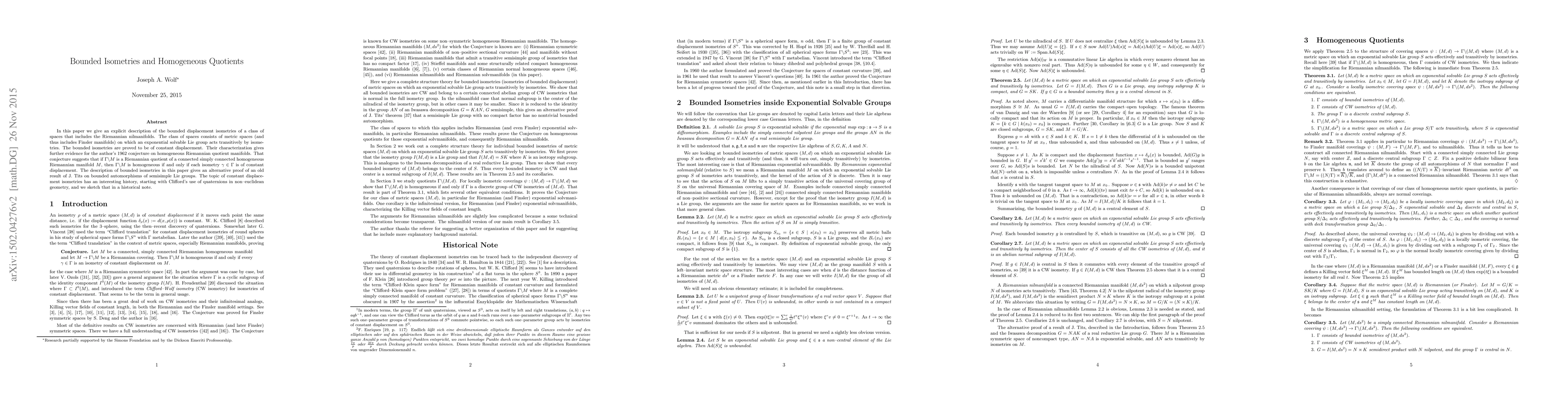 In this paper we give an explicit description of the bounded displacement isometries of a class of spaces that includes the Riemannian nilmanifolds. The class of spaces consists of metric spaces (and thus includes Finsler manifolds) on which an exponential solvable Lie group acts transitively by isometries. The bounded isometries are proved to be of constant displacement. Their characterization gives further evidence for the author's 1962 conjecture on homogeneous Riemannian quotient manifolds. That conjecture suggests that if $\Gamma \backslash M$ is a Riemannian quotient of a connected simply connected homogeneous Riemannian manifold $M$, then $\Gamma \backslash M$ is homogeneous if and only if each isometry $\gamma \in \Gamma$ is of constant displacement. Our description of bounded isometries gives an alternative proof of an old result of J. Tits on bounded automorphisms of semisimple Lie groups. The topic of constant displacement isometries has an interesting history, starting with Clifford's use of quaternions in non--euclidean geometry, and we sketch that in a historical note.