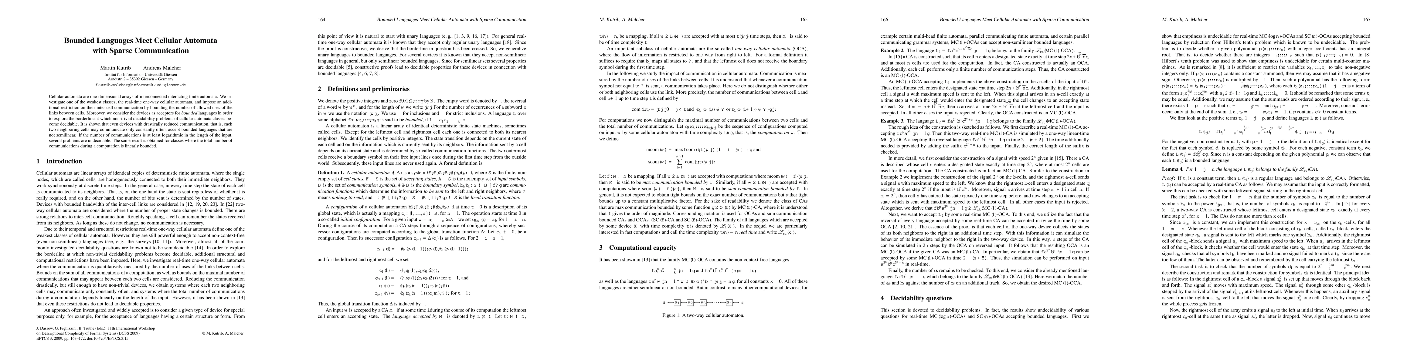 This paper explores real-time one-way cellular automata with sparse communication constraints, demonstrating that even limited interactions can accept non-semilinear bounded languages. It finds that when communication is logarithmically bounded, several problems become undecidable.