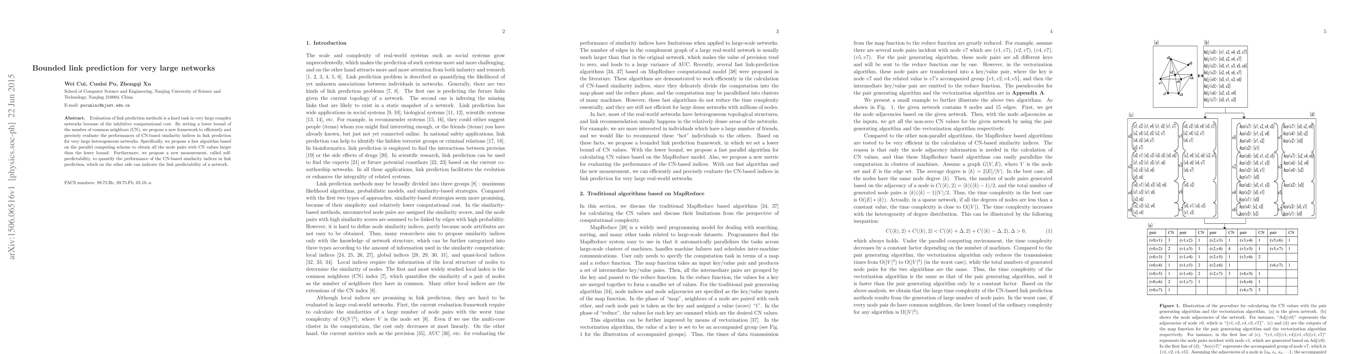 A new framework for efficiently evaluating link prediction methods in very large networks is proposed, using a lower bound on common neighbors to reduce computational cost. This method also introduces a novel metric called self-predictability to measure the performance of these similarity indices.