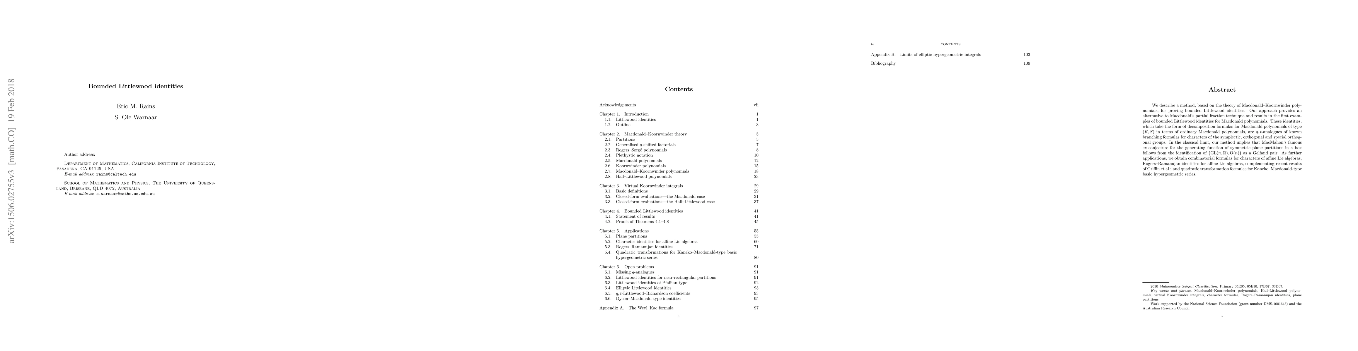 We describe a method, based on the theory of Macdonald-Koornwinder polynomials, for proving bounded Littlewood identities. Our approach provides an alternative to Macdonald's partial fraction technique and results in the first examples of bounded Littlewood identities for Macdonald polynomials. These identities, which take the form of decomposition formulas for Macdonald polynomials of type $(R,S)$ in terms of ordinary Macdonald polynomials, are $q,t$-analogues of known branching formulas for characters of the symplectic, orthogonal and special orthogonal groups. In the classical limit, our method implies that MacMahon's famous ex-conjecture for the generating function of symmetric plane partitions in a box follows from the identification of $(\mathrm{GL}(n,\mathbb{R}),\mathrm{O}(n))$ as a Gelfand pair. As further applications, we obtain combinatorial formulas for characters of affine Lie algebras; Rogers-Ramanujan identities for affine Lie algebras, complementing recent results of Griffin et al.; and quadratic transformation formulas for Kaneko--Macdonald-type basic hypergeometric series.