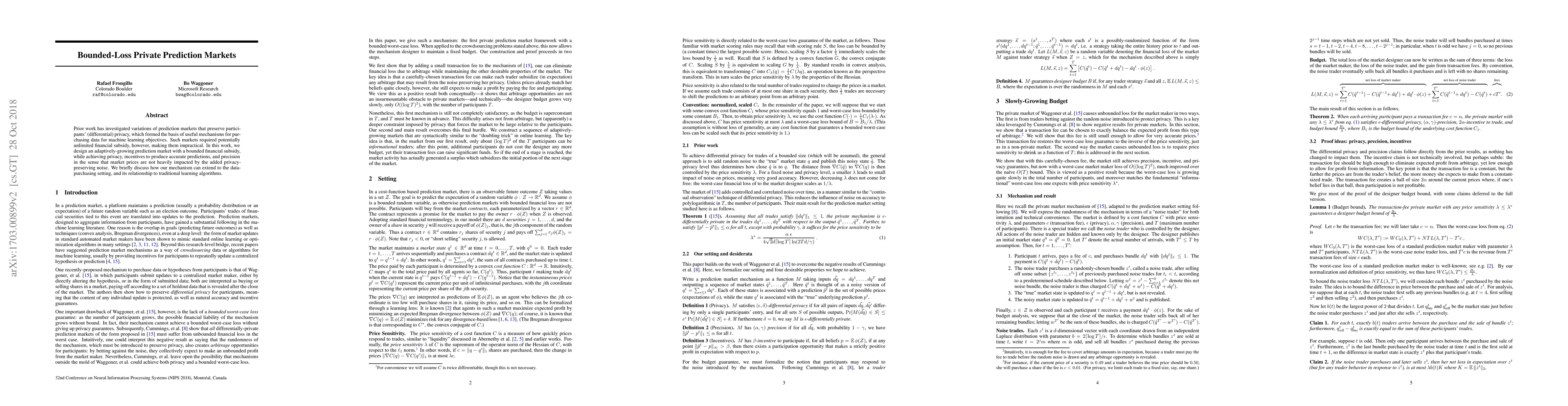 This paper introduces a prediction market model that limits the total financial cost while maintaining privacy and accuracy, making such markets more practical. The approach ensures reliable predictions without heavily distorting market prices, with potential applications in data purchasing and machine learning.