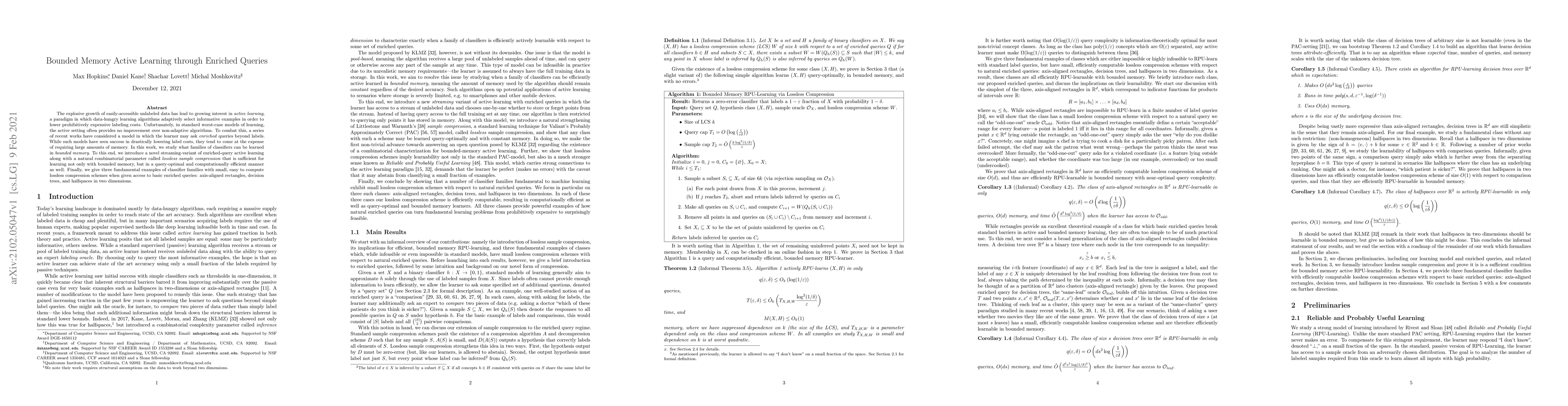 This paper proposes a novel streaming-variant of enriched-query active learning to address the challenge of learning classifiers under bounded memory constraints. It introduces a combinatorial parameter called lossless sample compression for efficient and query-optimal learning, and provides examples for axis-aligned rectangles, decision trees, and two-dimensional halfspaces.