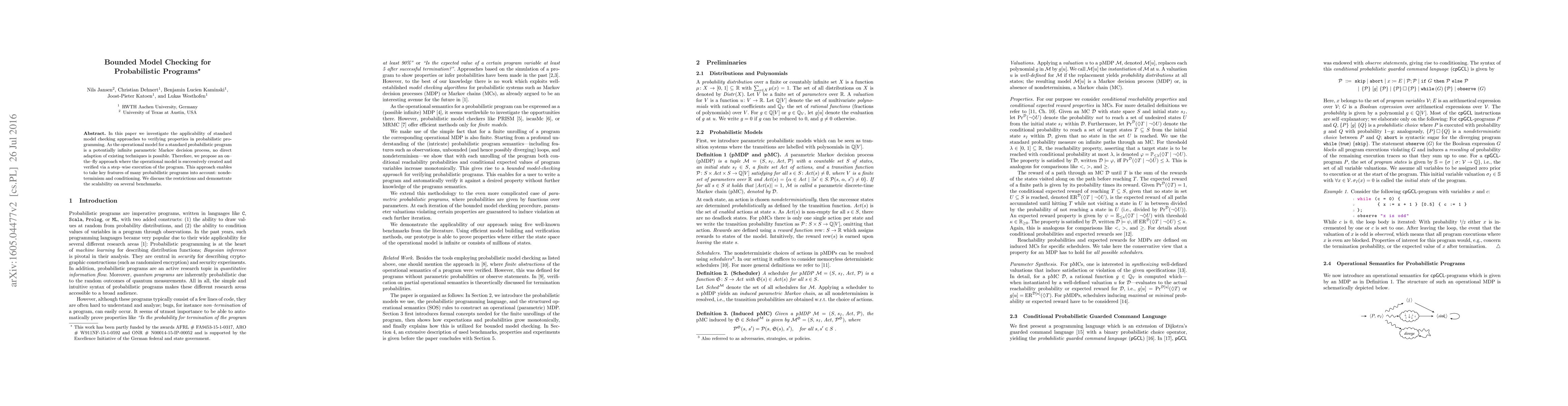 This paper proposes an on-the-fly bounded model checking approach for verifying properties in probabilistic programs, addressing the challenge of their infinite parametric Markov decision process model. The method enables consideration of nondeterminism and conditioning, demonstrating scalability through benchmark tests.