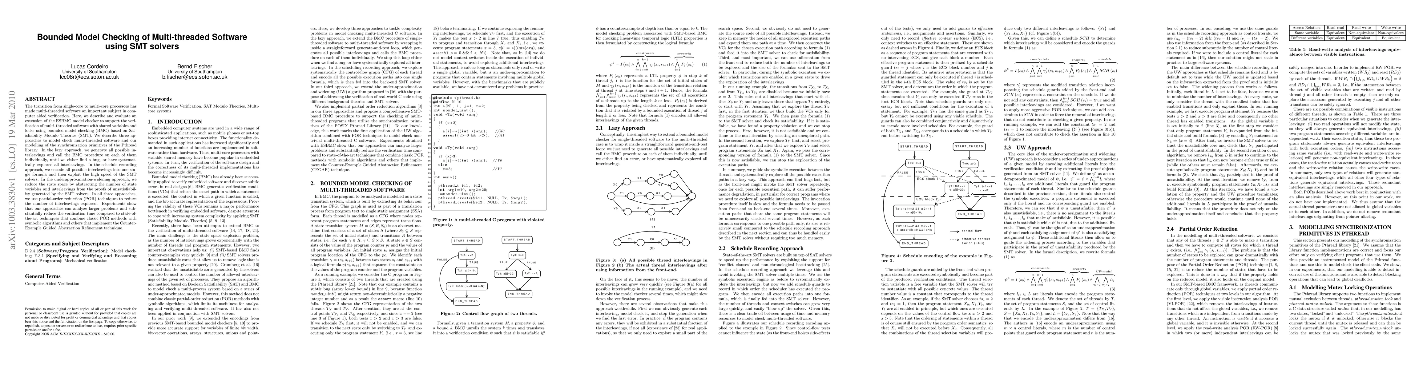 This paper extends ESBMC to verify multi-threaded software using bounded model checking and SMT solvers. It presents three methods: lazy interleaving generation, schedule recording, and underapproximation-widening, all employing partial-order reduction to reduce exploration. Experiments demonstrate improved analysis of larger problems and reduced verification time compared to existing techniques.