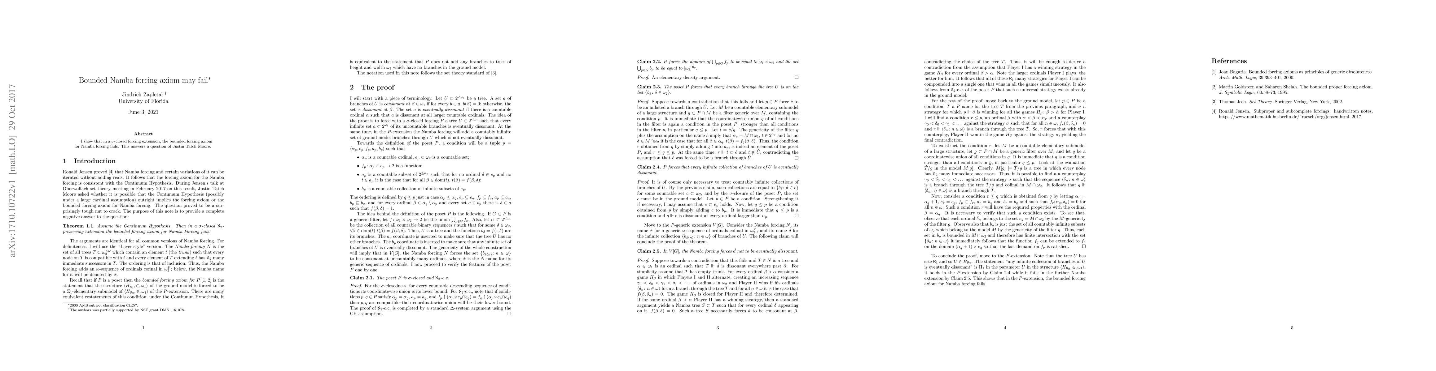 Summary: The paper demonstrates that the bounded forcing axiom for Namba forcing can fail in a sigma-closed forcing extension, resolving a question posed by Justin Tatch Moore. This finding highlights the nuanced behavior of forcing axioms in set theory.
