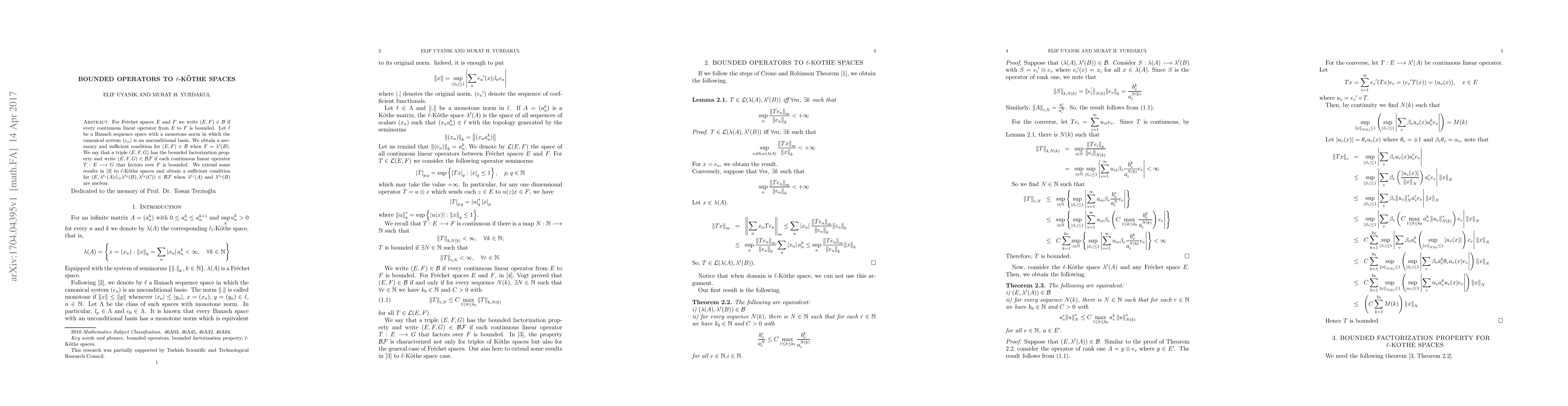 This paper establishes a necessary and sufficient condition for continuous linear operators from Fréchet space E to λ^l(B) to be bounded. It also extends results to l-Köthe spaces and provides a sufficient condition for bounded factorization in triples involving nuclear spaces.