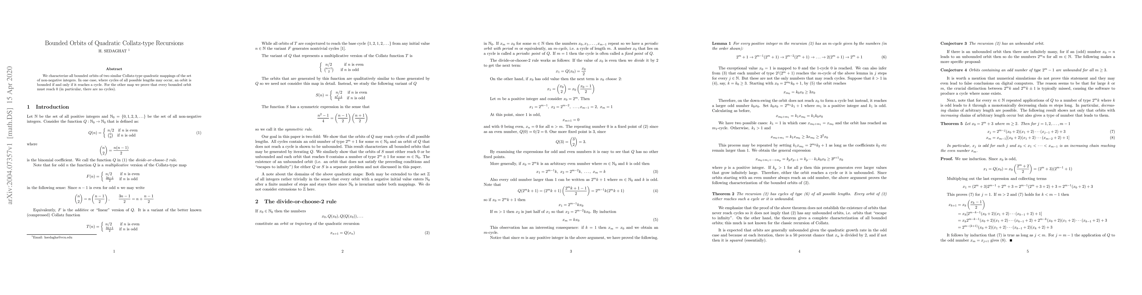 This paper characterizes bounded orbits of two quadratic Collatz-type recursions on non-negative integers, showing that for one map, bounded orbits reach cycles, while for the other, all bounded orbits converge to 0, proving no cycles exist.