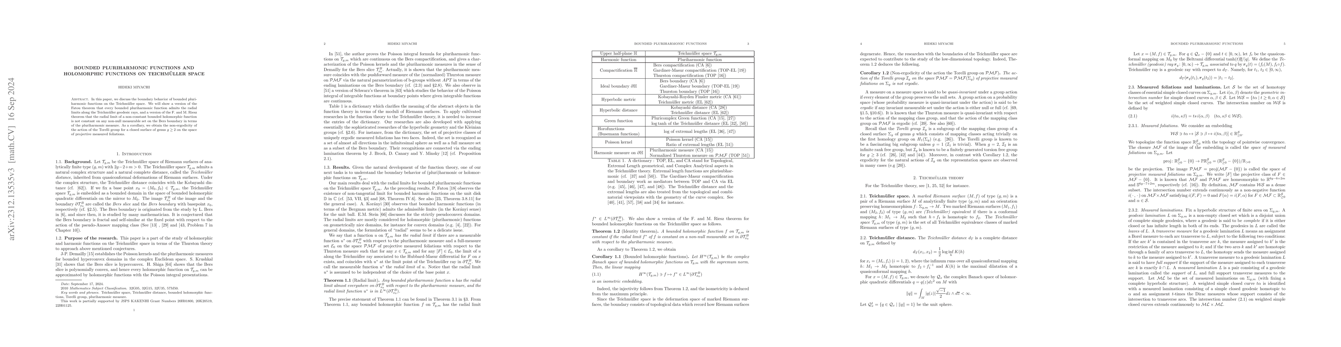 Summary: This paper explores the boundary behavior of bounded pluriharmonic functions on Teichmüller space, proving the existence of radial limits for these functions along Teichmüller geodesic rays and establishing a non-constant result for holomorphic functions. The study also reveals the non-ergodicity of the Torelli group's action on projective measured foliations.