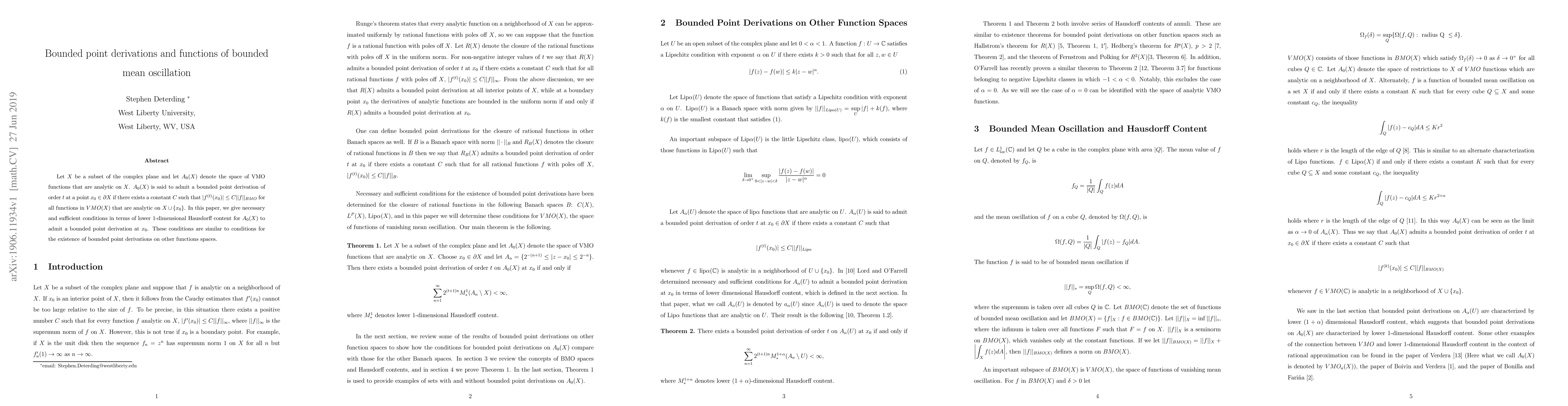 Let $X$ be a subset of the complex plane and let $A_0(X)$ denote the space of VMO functions that are analytic on $X$. $A_0(X)$ is said to admit a bounded point derivation of order $t$ at a point $x_0 \in \partial X$ if there exists a constant $C$ such that $|f^{(t)}(x_0)|\leq C ||f||_{BMO}$ for all functions in $VMO(X)$ that are analytic on $X \cup \{x_0\}$. In this paper, we give necessary and sufficient conditions in terms of lower $1$-dimensional Hausdorff content for $A_0(X)$ to admit a bounded point derivation at $x_0$. These conditions are similar to conditions for the existence of bounded point derivations on other functions spaces.