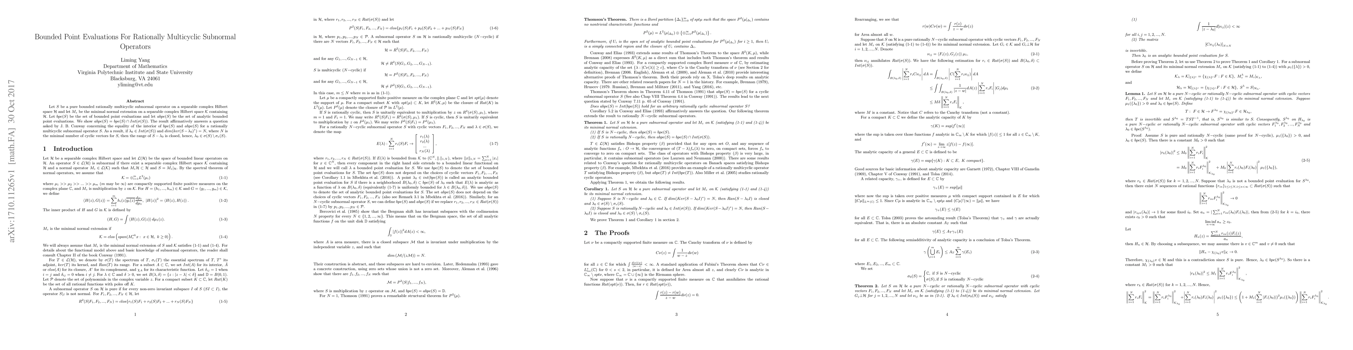 Let $S$ be a pure bounded rationally multicyclic subnormal operator on a separable complex Hilbert space $\mathcal H$ and let $M_z$ be the minimal normal extension on a separable complex Hilbert space $\mathcal K$ containing $\mathcal H.$ Let $bpe(S)$ be the set of bounded point evaluations and let $abpe(S)$ be the set of analytic bounded point evaluations. We show $abpe(S) = bpe(S) \cap Int(\sigma (S)).$ The result affirmatively answers a question asked by J. B. Conway concerning the equality of the interior of $bpe(S)$ and $abpe(S)$ for a rationally multicyclic subnormal operator $S.$ As a result, if $\lambda_0\in Int(\sigma (S))$ and $dim(ker(S-\lambda_0)^*) = N,$ where $N$ is the minimal number of cyclic vectors for $S,$ then the range of $S-\lambda_0$ is closed, hence, $\lambda_0 \in \sigma (S) \setminus \sigma_e (S).$