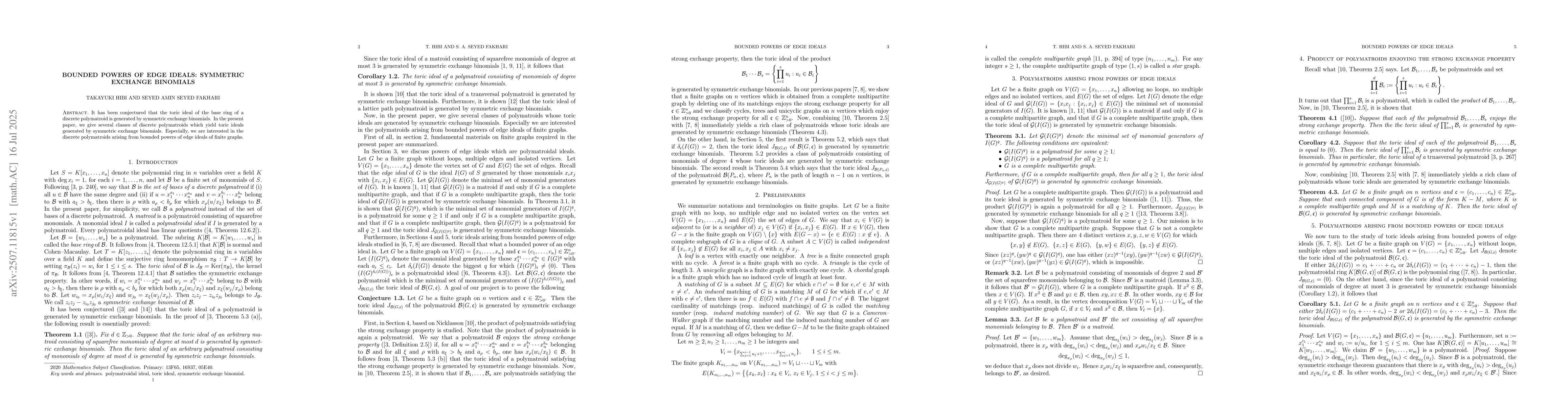 It has been conjectured that the toric ideal of the base ring of a discrete polymatroid is generated by symmetric exchange binomials. In the present paper, we give several classes of discrete polymatroids which yield toric ideals generated by symmetric exchange binomials. Especially, we are interested in the discrete polymatroids arising from bounded powers of edge ideals of finite graphs.