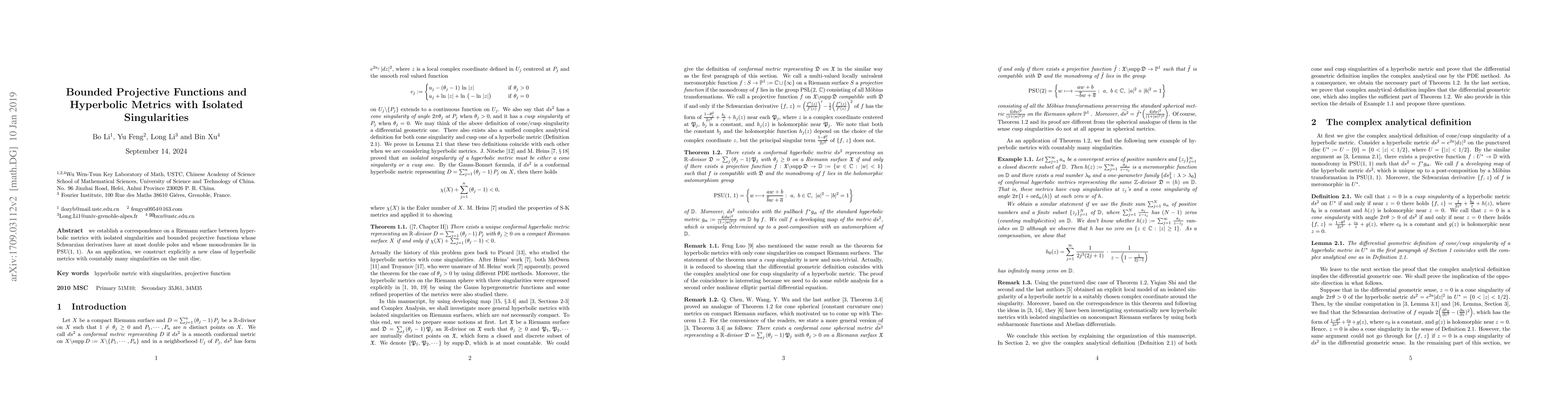 We establish a correspondence on a Riemann surface between hyperbolic metrics with isolated singularities and bounded projective functions whose Schwarzian derivatives have at most double poles and whose monodromies lie in ${\rm PSU}(1,\,1)$. As an application, we construct explicitly a new class of hyperbolic metrics with countably many singularities on the unit disc.
