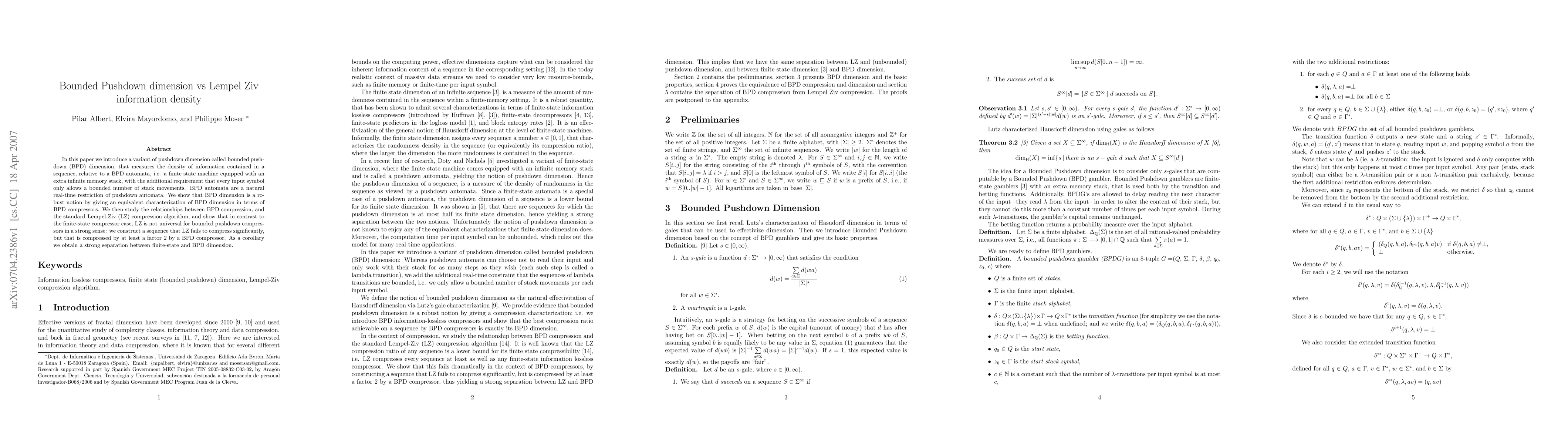 This paper introduces the bounded pushdown (BPD) dimension, a variant of pushdown dimension that measures information density using BPD automata, which have a restricted stack behavior. It demonstrates BPD dimension's robustness and shows a significant separation between BPD and Lempel-Ziv (LZ) compression, proving LZ's non-universality for BPD compressors.