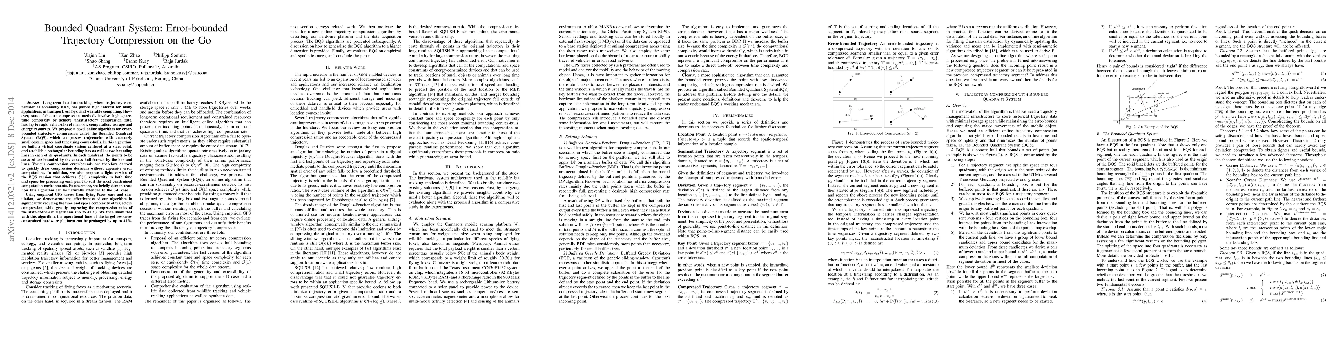 The Bounded Quadrant System (BQS) proposes an online algorithm for error-bounded trajectory compression that significantly reduces space and time complexity using convex-hulls. The BQS algorithm achieves up to 47% improvement in compression rates compared to state-of-the-art methods, while extending to 3-D cases and offering a lightweight version with $\mathcal{O}(1)$ complexity.