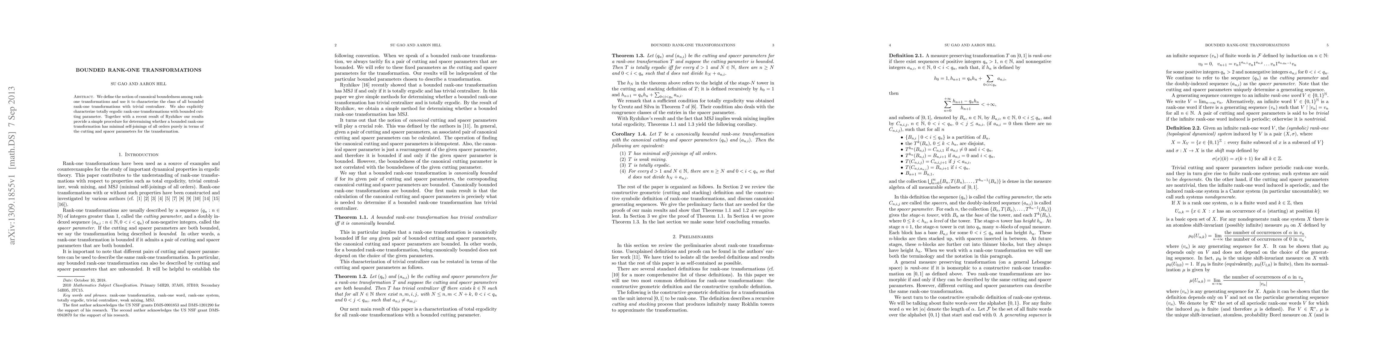 This paper defines canonical boundedness for rank-one transformations and characterizes those with trivial centralizers. It also provides a method to determine minimal self-joinings of bounded transformations based on their cutting and spacer parameters.
