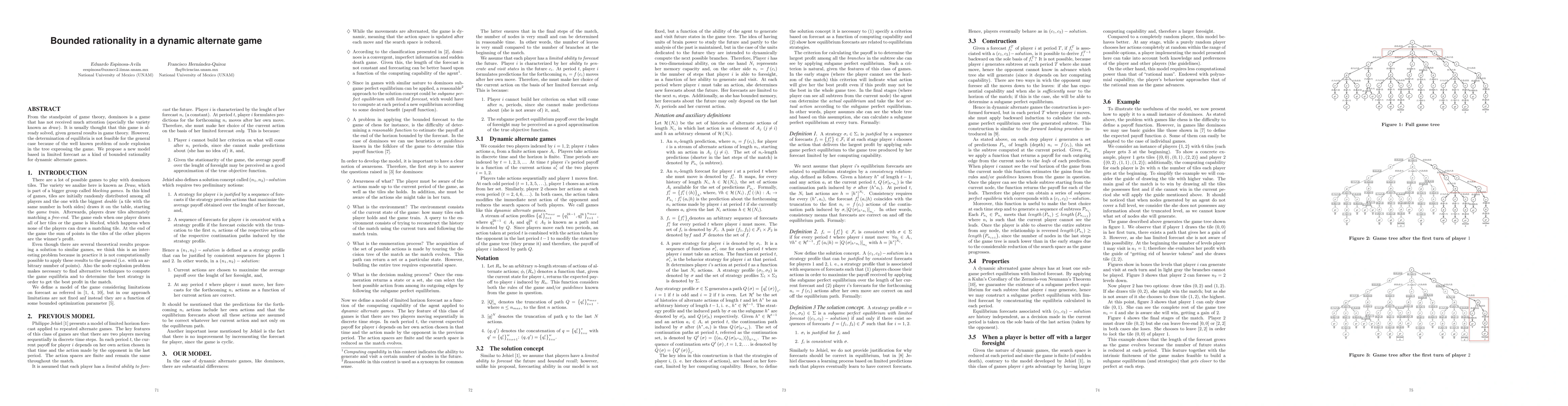 From the standpoint of game theory, dominoes is a game that has not received much attention (specially the variety known as draw). It is usually thought that this game is already solved, given general results in game theory. However, the determination of equilibria is not feasible for the general case because of the well known problem of node explosion in the tree expressing the game. We propose a new model based in limited forecast as a kind of bounded rationality for dynamic alternate games.