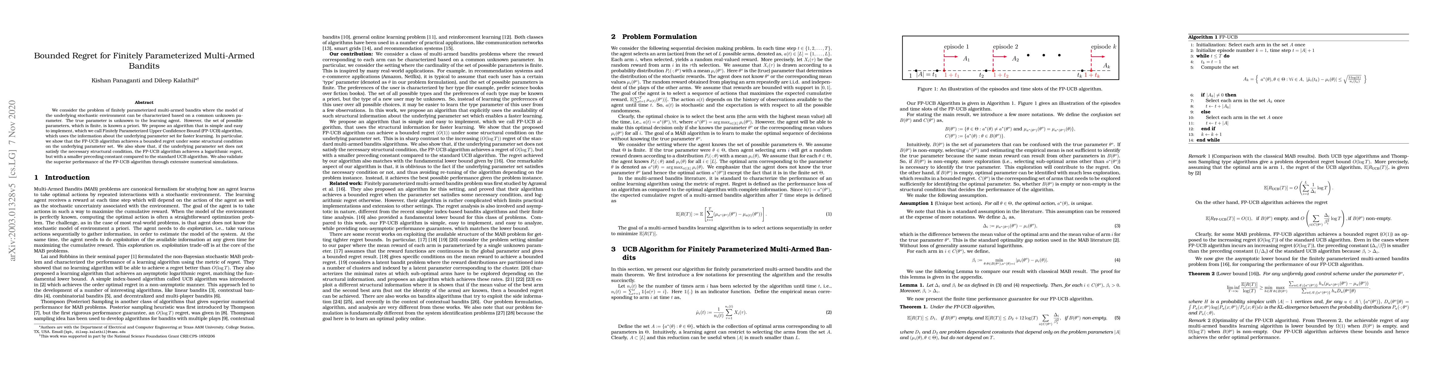 This paper proposes the FP-UCB algorithm for finitely parameterized multi-armed bandits, achieving bounded regret under structural conditions on the parameter set, and logarithmic regret otherwise with a smaller constant. Numerical simulations validate its superior performance.