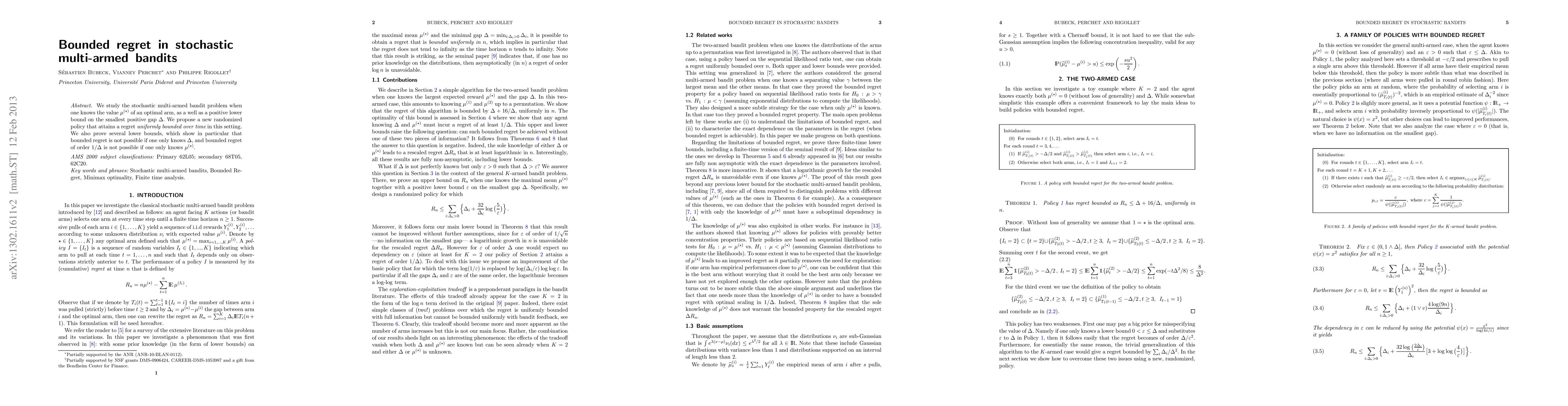 This paper introduces a new randomized policy for the stochastic multi-armed bandit problem, achieving uniformly bounded regret when both the optimal arm's value and a positive gap are known. It also establishes lower bounds demonstrating that bounded regret is unattainable under limited information.