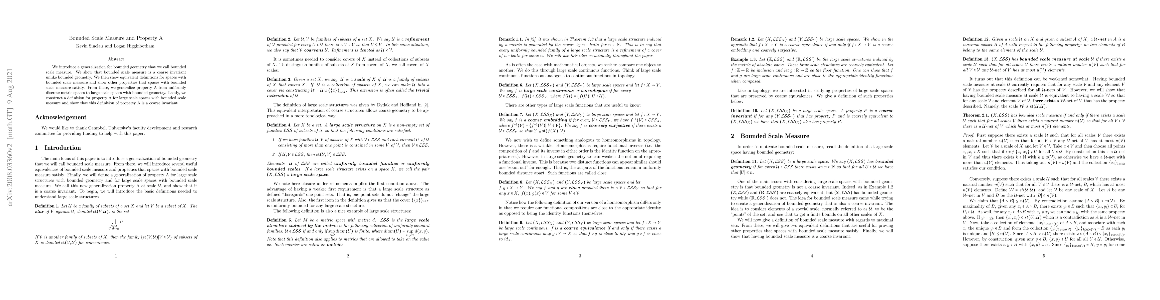 We introduce a generalization for bounded geometry that we call bounded scale measure. We show that bounded scale measure is a coarse invariant unlike bounded geometry. We then show equivalent definitions for spaces with bounded scale measure and show other properties that spaces with bounded scale measure satisfy. From there, we generalize property A from uniformly discrete metric spaces to large scale spaces with bounded geometry. Lastly, we construct a definition for property A for large scale spaces with bounded scale measure and show that this definition of property A is a coarse invariant.
