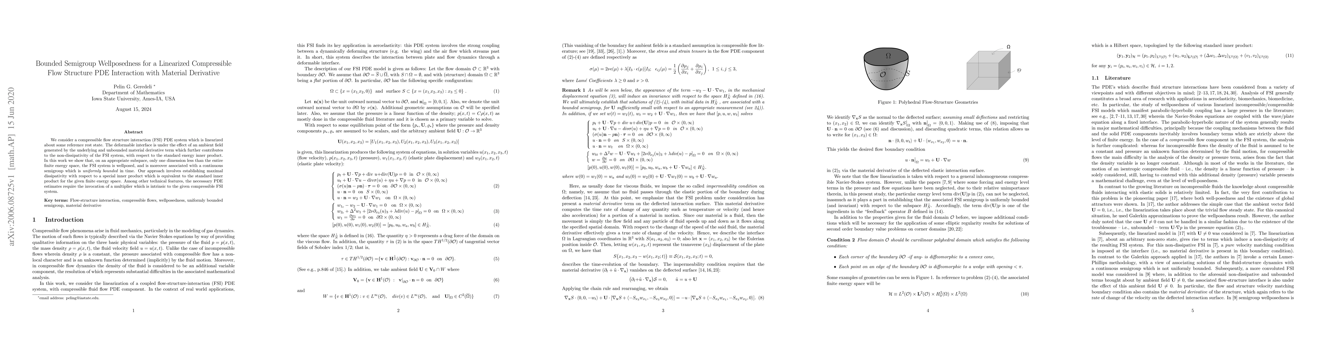 We consider a compressible flow structure interaction (FSI) PDE system which is linearized about some reference rest state. The deformable interface is under the effect of an ambient field generated by the underlying and unbounded material derivative term which further contributes to the non-dissipativity of the FSI system, with respect to the standard energy inner product. In this work we show that, on an appropriate subspace, only one dimension less than the entire finite energy space, the FSI system is wellposed, and is moreover associated with a continuous semigroup which is \emph{uniformly bounded} in time. Our approach involves establishing maximal dissipativity with respect to a special inner product which is equivalent to the standard inner product for the given finite energy space. Among other technical features, the necesssary PDE estimates require the invocation of a multiplier which is intrinsic to the given compressible FSI system.