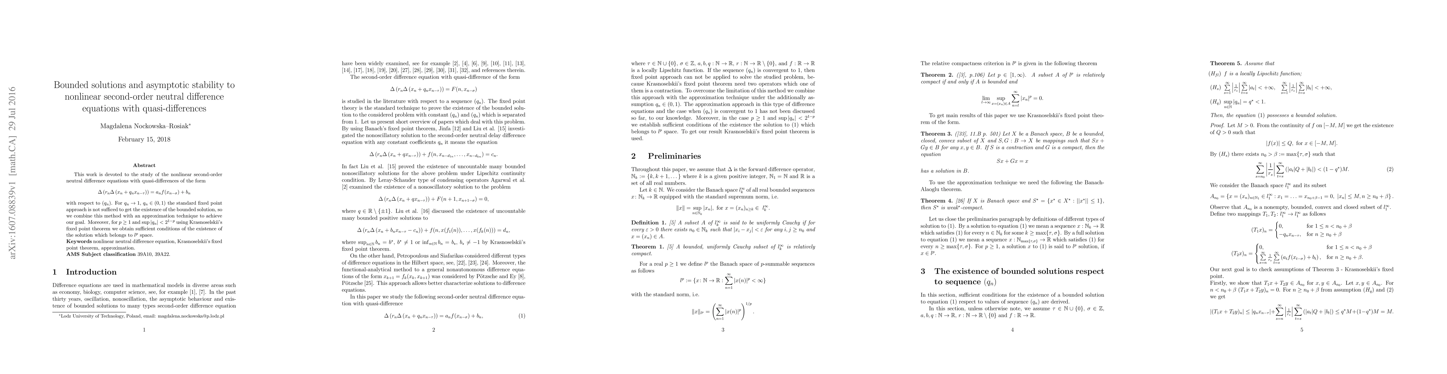 This paper investigates nonlinear second-order neutral difference equations with quasi-differences, proving bounded solution existence and asymptotic stability using a combination of fixed point and approximation techniques. It also applies Krasnoselskii's fixed point theorem to establish conditions for solutions in $l^p$ space.