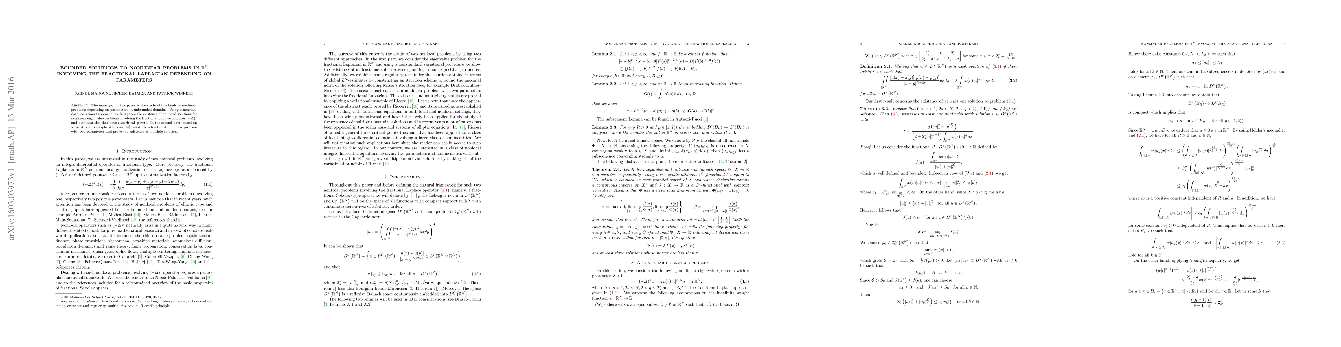 The paper investigates existence of bounded solutions for nonlinear problems involving the fractional Laplace operator in unbounded domains, with key findings including subcritical growth and multiple solutions.