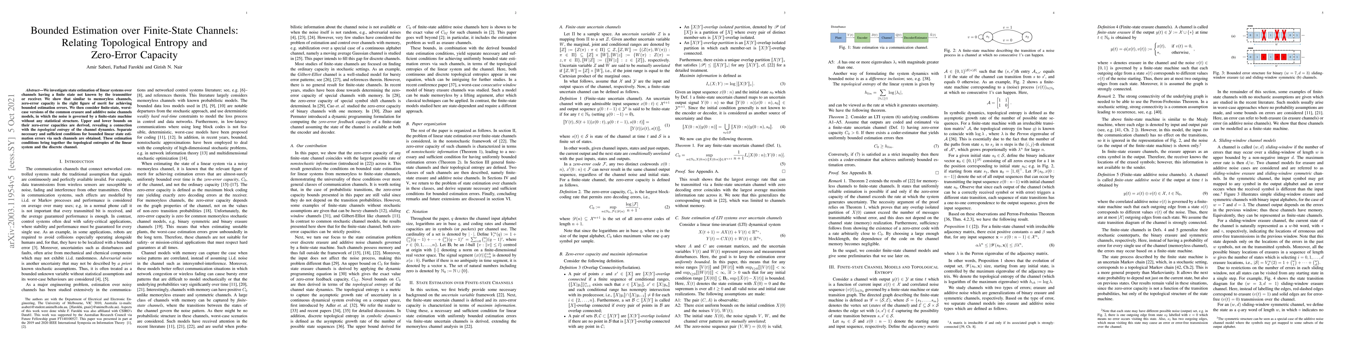 This paper explores state estimation in linear systems over finite-state channels where neither the transmitter nor the receiver knows the channel state. It establishes that zero-error capacity is crucial for bounded estimation errors, and derives upper and lower bounds on the zero-error capacities of finite-state erasure and additive noise channels, linking these bounds to the topological entropy of the channel dynamics.