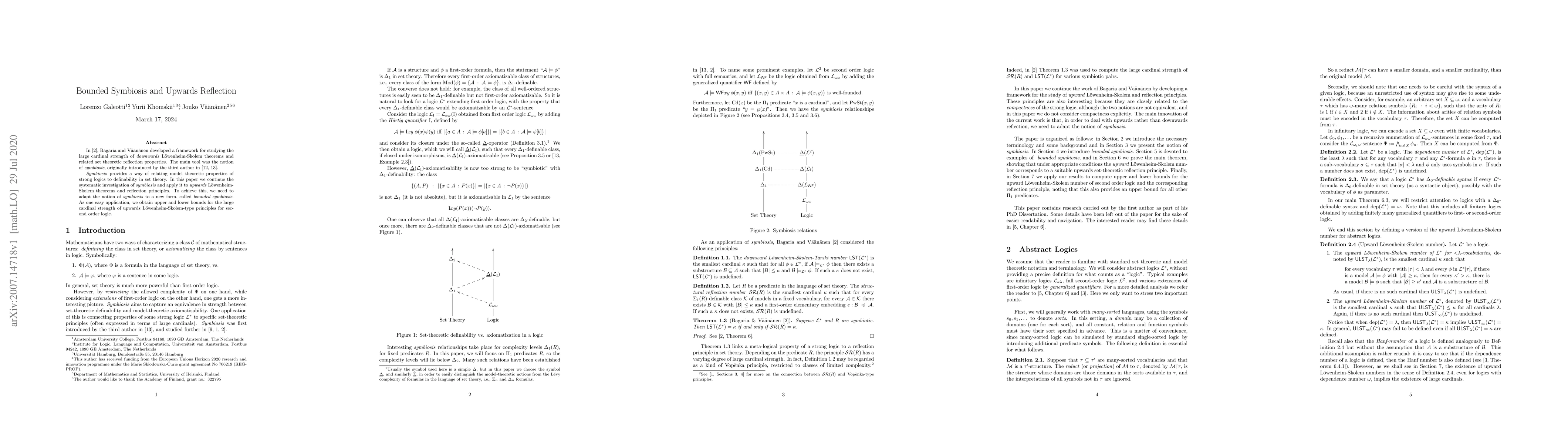 Bagaria and V\"a\"an\"anen developed a framework for studying the large cardinal strength of downwards L\"owenheim-Skolem theorems and related set theoretic reflection properties. The main tool was the notion of symbiosis, originally introduced by the third author. Symbiosis provides a way of relating model theoretic properties of strong logics to definability in set theory. In this paper we continue the systematic investigation of symbiosis and apply it to upwards L\"owenheim-Skolem theorems and reflection principles. To achieve this, we need to adapt the notion of symbiosis to a new form, called bounded symbiosis. As one easy application, we obtain upper and lower bounds for the large cardinal strength of upwards L\"owenheim-Skolem-type principles for second order logic.