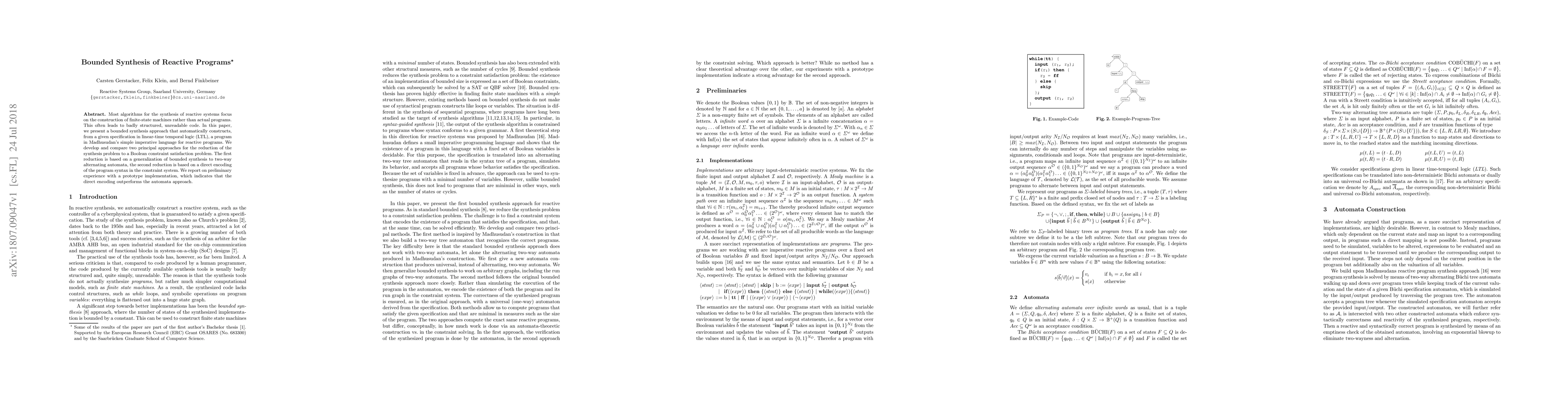 This paper introduces a bounded synthesis method to generate readable reactive programs from LTL specifications using Madhusudan's simple imperative language. It compares two synthesis approaches, finding that direct encoding of program syntax in constraints outperforms the automata-based method.